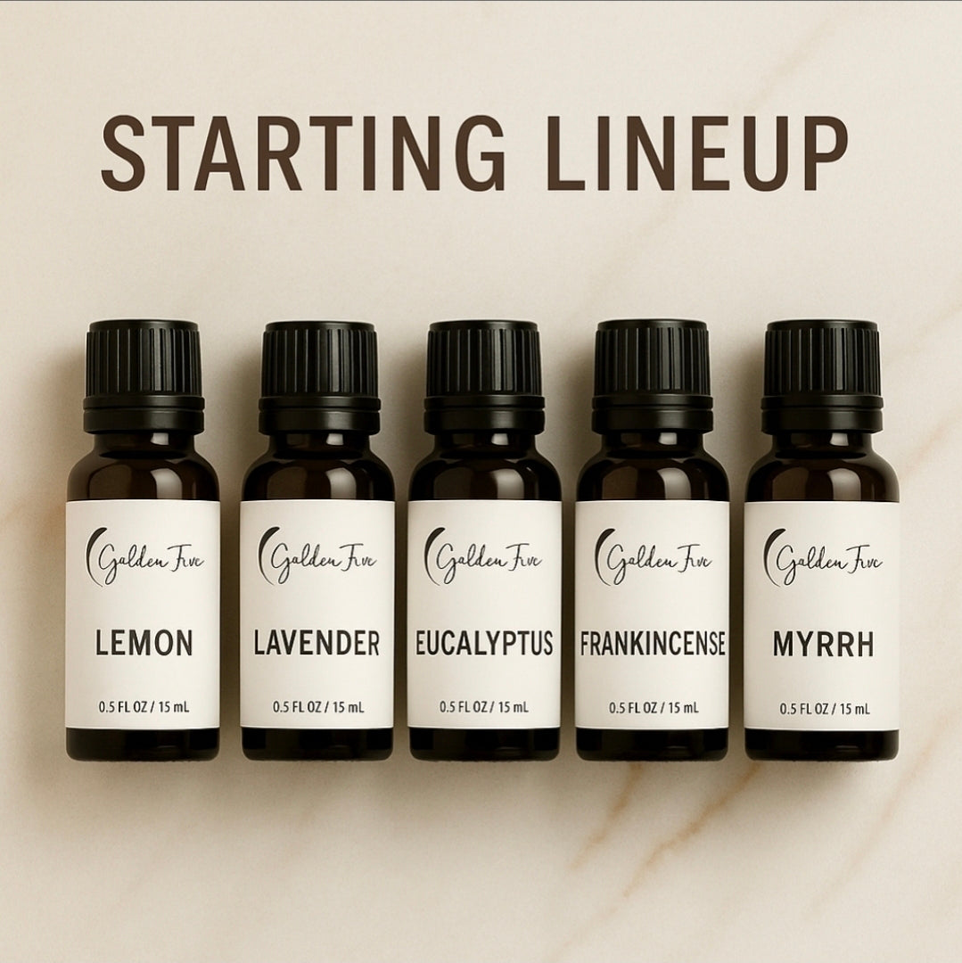 Discover the power of nature with Golden5ive’s complete Essential Oil Collection — a carefully curated lineup of five timeless oils: Lavender, Lemon, Frankincense, Myrrh, and Eucalyptus. Together, these versatile oils create the perfect foundation for wellness rituals, emotional balance, and natural home care.